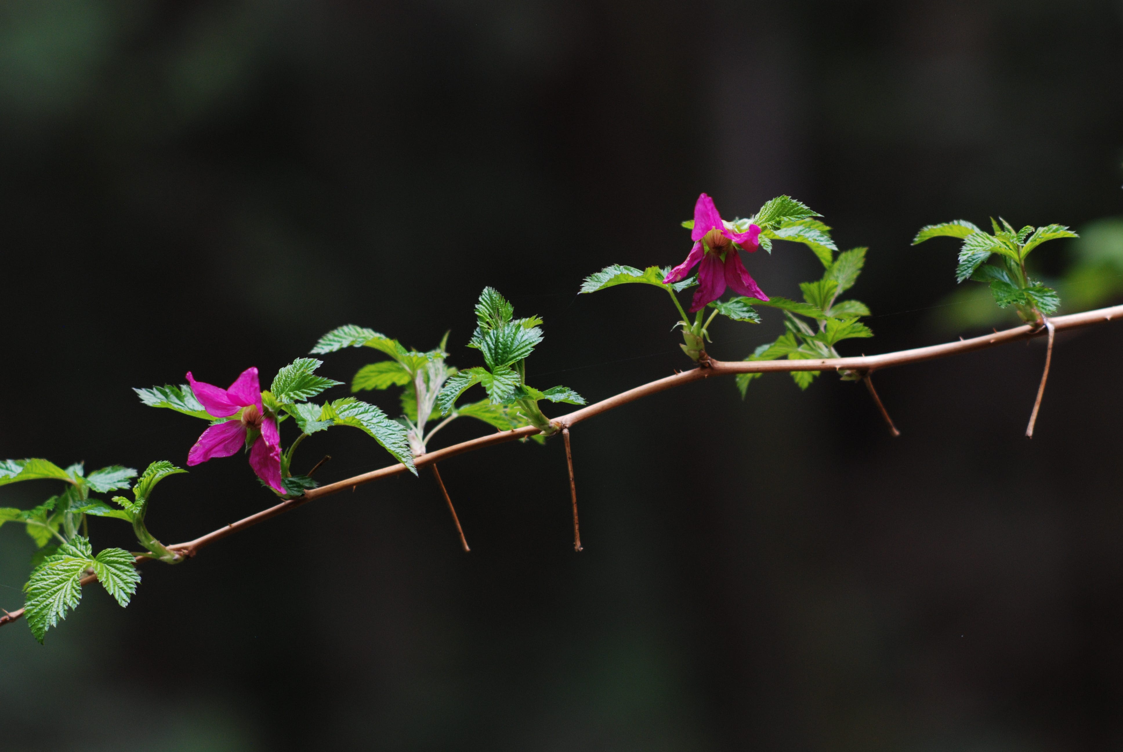 -Five-pointed blossoms on a thread-like stem of salmonberry.