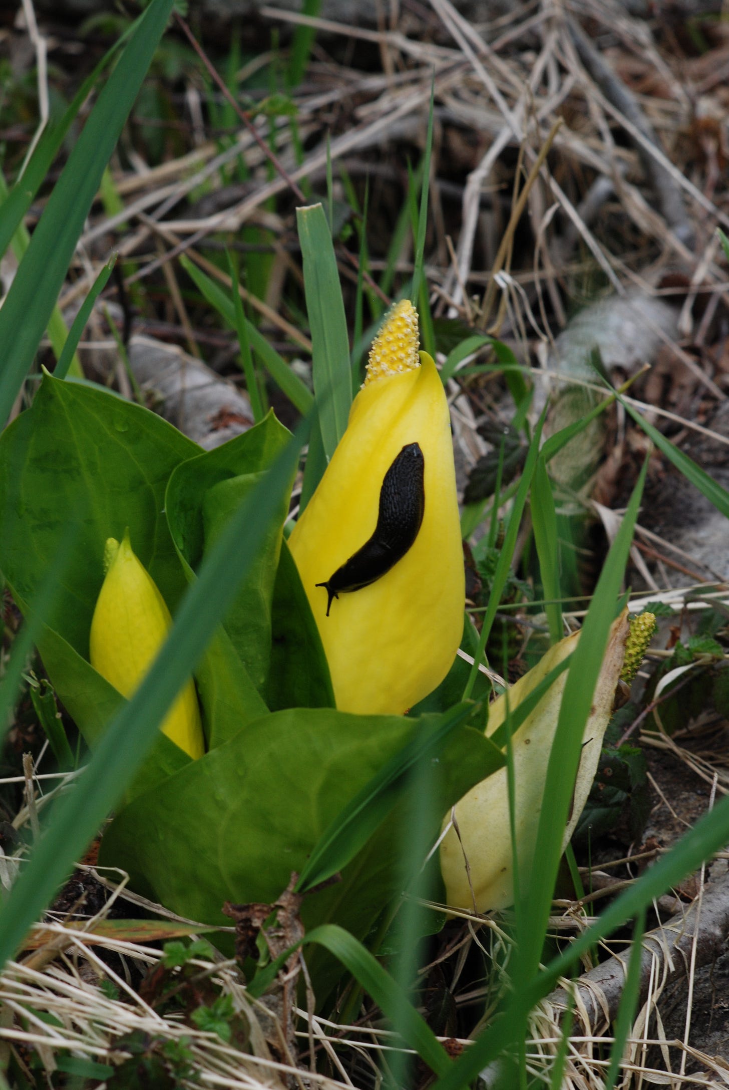 As I set out with my camera this morning, I had it in my mind to capture both a slug and the never disappointing blooms of the skunk cabbage flower. If you are not familiar with the PNW slug catalog, I am sorry that you have been denied this benefit of the human experience. Likewise, the skunk cabbage bloom. Most of the year, you would never know this plant is alive and well anywhere near your current location. Come April and May though, you will not be able to ignore either its extreme illumination from a dreary wetland bog on the side of the road, nor its distinct perfume which will remind you very much of your dear cousin, Mary Jane. Thank you to the good old Mother Earth for bringing these soulmates together today. Technically, this bog is not on the trail, but April and May insist on highlighting the skunk cabbage.