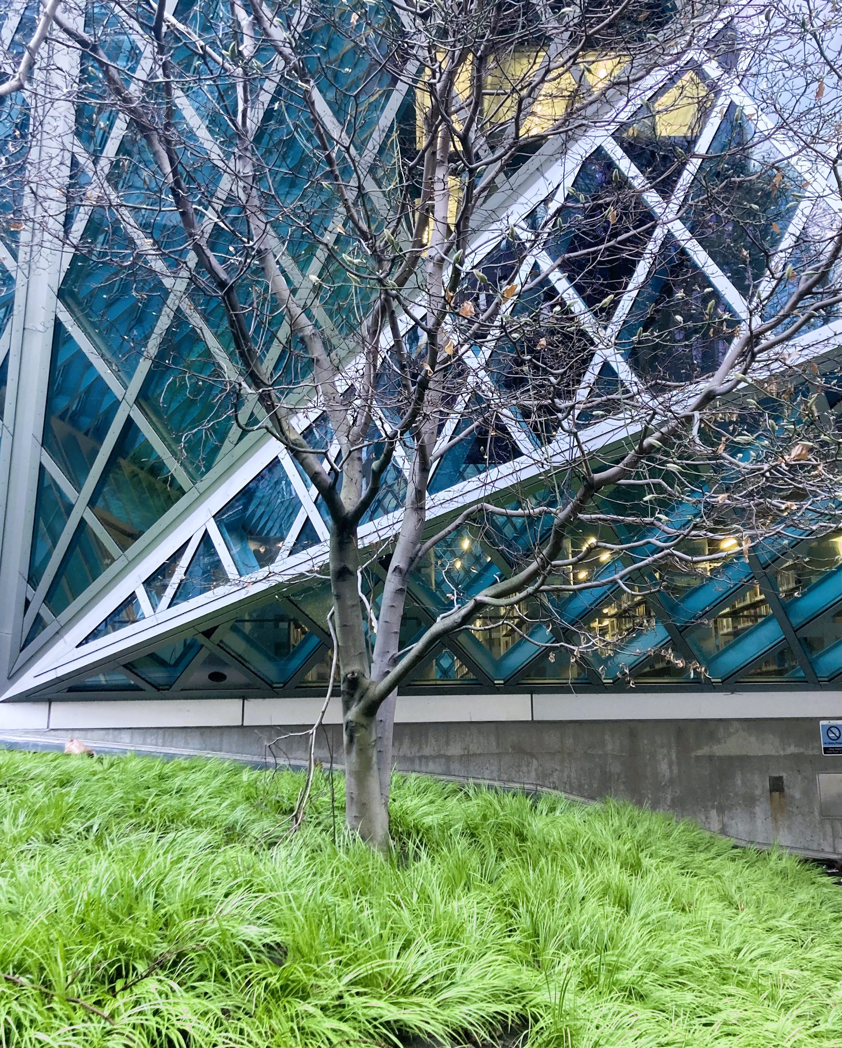 Perhaps it’s because I’m now more accustomed to seeing trees among even more trees that I was drawn to snapping phoneos1 of trees against a backdrop of buildings. Again, nothing unusual here, but for some reason, I felt compelled to stop and click. Thank you to The Dog for his patience during this procedure.
