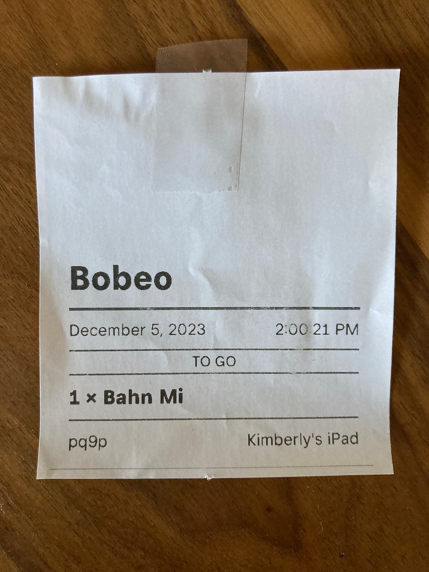 I’m still debating how to pronounce this nickname, but am leaning strongly toward Bo-BAY-oh. BAH-bee-oh is a little too country-western for my particular buck, though there’s a lot of room for interpretation on this. Maybe this Kimberly, or her iPad, has (secretly) in their heart of hearts, always wanted to fall in love with a Bobeo, and until that day comes, crafting a beautifully stuffed Bahn Mi to go for someone whose name is a little bit similar will just have to do.