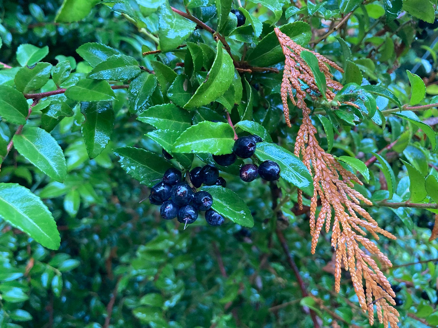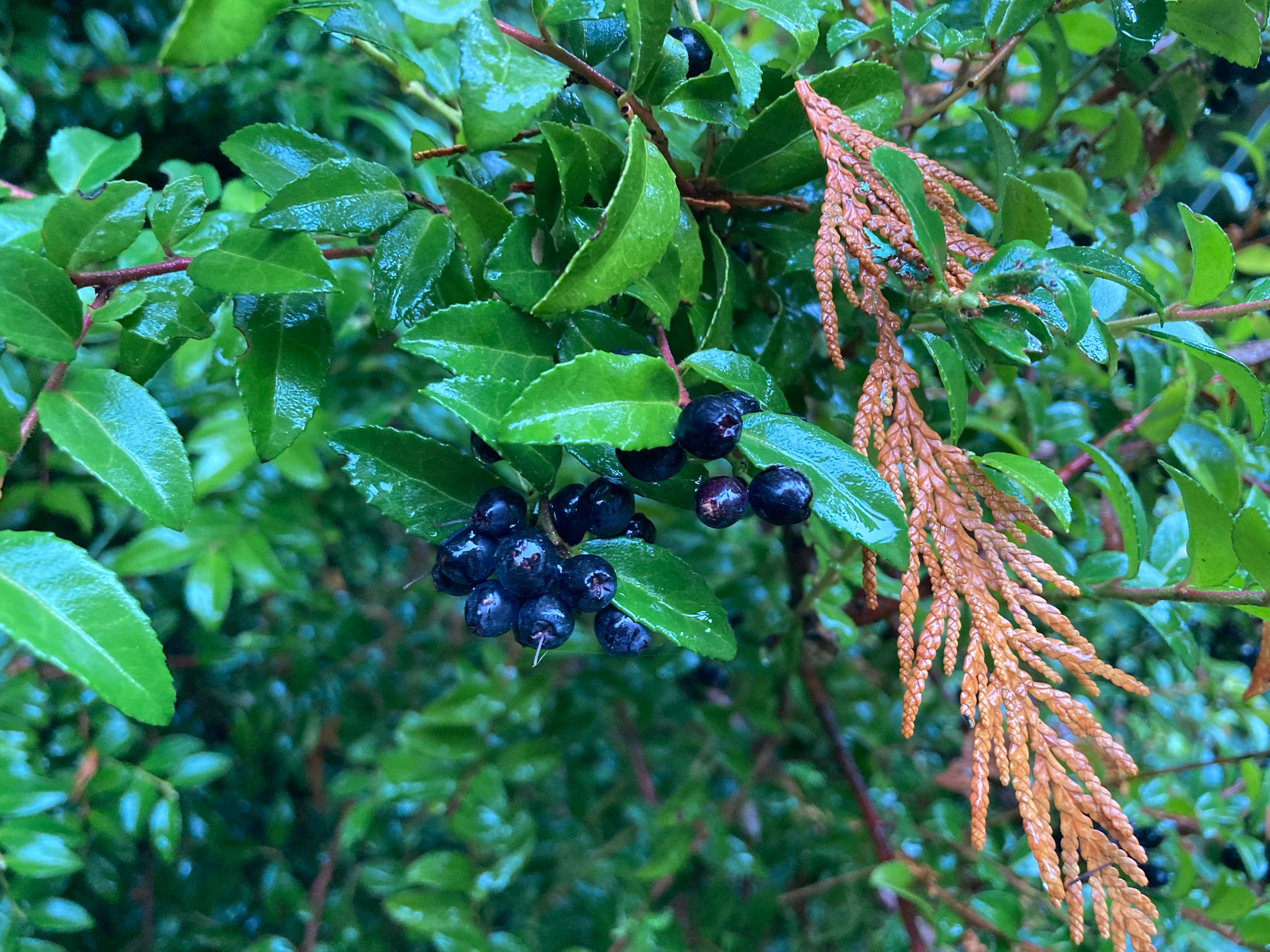 Discovering that the evergreen shrub I found growing voraciously in the understory and along the edges of the forest on our property was huckleberry made me sigh with relief. At first, I thought it might be yet another invasive species because it is so hearty and pervasive. But by the first fall here, when those dark little berries shined, I had glorious visions of muffins and pies and cobblers. Have I made any such treat with these berries? No. However, I just learned that the berries become their sweetest after the first frost which, I imagine, the birds already know. So I’ll wait patiently for the nights to get just a little closer to 32, after which I’ll be fighting (in a friendly way) the chickadees and robins to pick those black beauties from their stems.